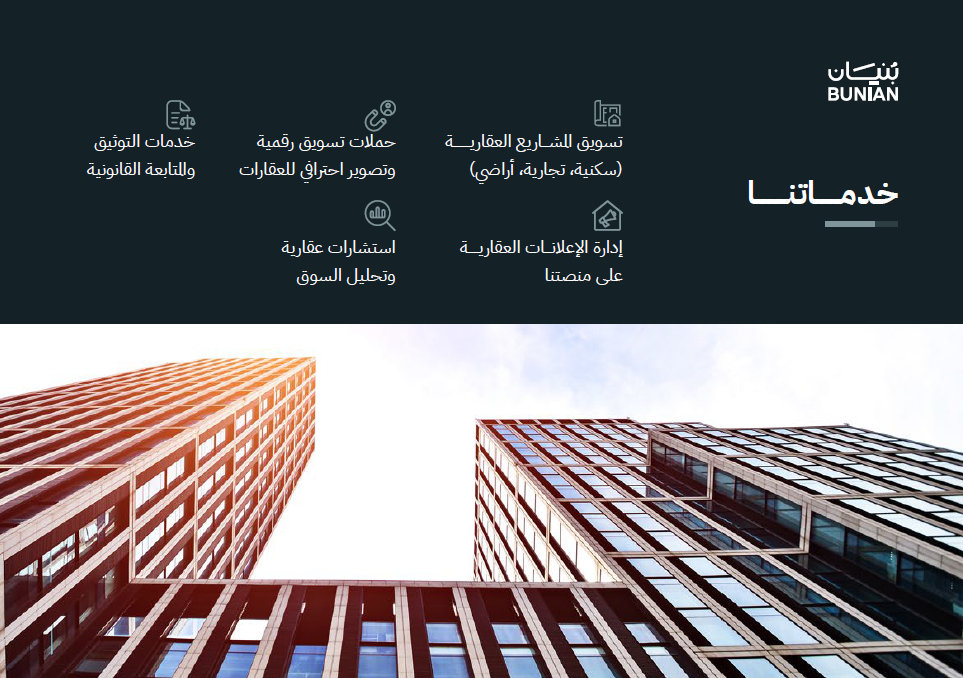 في بنيان نقدم حلولًا عقارية متكاملة تبدأ من خدمات التوثيق والمتابعة القانونية، وصولًا إلى حملات التسويق الرقمي والتصوير الاحترافي للعقارات. نتميز بقدرتنا على تسويق المشاريع العقارية بجميع أنواعها (سكنية، تجارية، وأراضٍ) من خلال استراتيجيات مدروسة وشبكة تسويقية واسعة. كما نوفر استشارات عقارية دقيقة وتحليلات متعمقة للسوق تساعد عملاءنا على اتخاذ قرارات استثمارية صائبة، بالإضافة إلى إدارة الإعلانات العقارية على منصتنا بكفاءة عالية، لضمان وصول العقار إلى الشريحة المستهدفة وتحقيق أفضل النتائج.