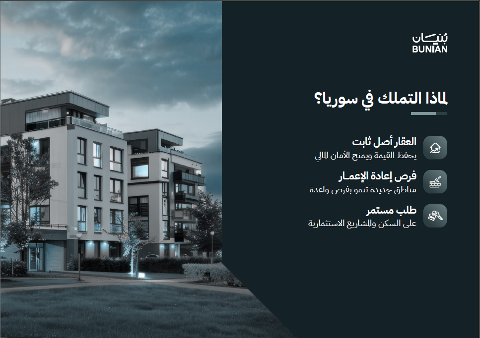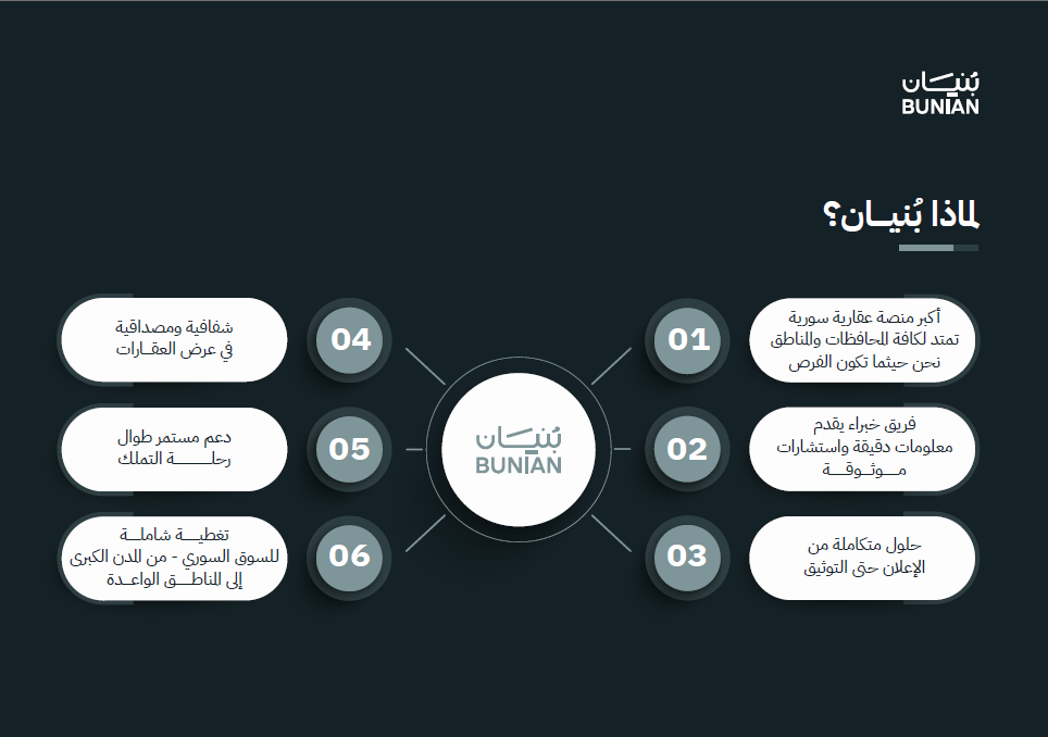 بنيان ليست مجرد منصة عقارية، بل شريك موثوق في رحلتك نحو التملك والاستثمار. نحن أكبر منصة عقارية سورية تمتد لتغطي جميع المحافظات والمناطق، حيث نكون دائمًا عند نقطة تلاقي الفرص. بفضل فريق من الخبراء نزوّدك بمعلومات دقيقة واستشارات موثوقة، ونوفر حلولًا متكاملة تبدأ من الإعلان والتسويق مرورًا بالتوثيق والمتابعة القانونية. نؤمن بالشفافية والمصداقية في عرض العقارات، ونرافقك بدعم متواصل طوال رحلة التملك. ومع تغطيتنا الشاملة للسوق السوري، من المدن الكبرى إلى المناطق الواعدة، نضمن لك تجربة عقارية آمنة وموثوقة تحقق تطلعاتك.